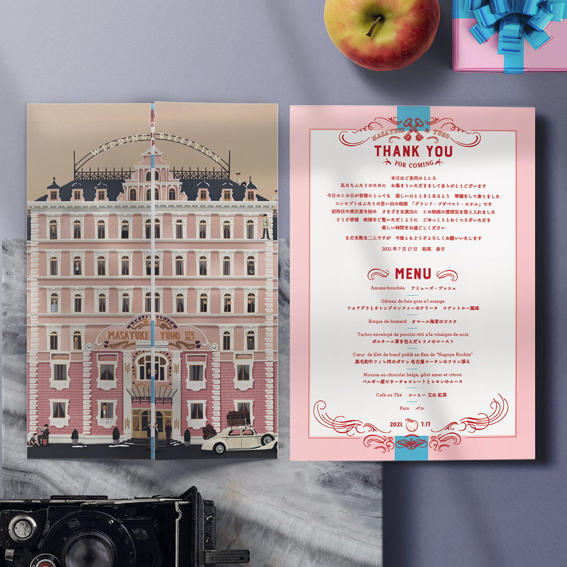 | contents | ①表紙 ②中面(中央):席次表 ③中面(左右):プロフィール ④裏表紙:ご挨拶・メニュー |